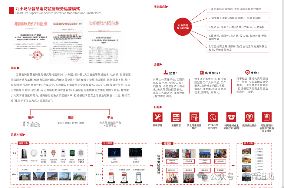 因地制宜出实招 压实责任抓落实各地迅速部署推进安全生产治本攻坚三年行动 “扎实开展安全生产治本攻坚三年行动,加强重点行业领域风险隐患排查整治,压实各方责任,坚决遏制重特大事故发生。”今年的政府工作报告专门对安全生产治本攻坚三年行动(以下简称三年行动)作出部署,可见党中央、国务院对这一工作的高度重视。 同时在国务院安委会部署开展三年行动后,各地迅速贯彻落实,许多省份党政主要负责人及时组织部署,并结合总体方案明确具体措施进行细化落实。截至目前,省级党政主要领导专题研究210余次、带队督导检查160余次。 万霖智慧经过的不断创新和发展,打造全方位、无死角的城市安全防控基础网络,综合运用物联网、云计算、大数据等新一代信息技术,针对九小场所、企事业单位、学校医院、养老机构、工厂园区、文旅古建、小区物业、仓储物流等全场景整套智慧消防系统解决方案,提升消防预警能力,及时消除火灾隐患,防患以未“燃”。公司秉承“以客户为导向、以数据为中心、以平台为服务”的经营理念,践行“万物互联、守望城霖”的核心价值观,助力人人享有安全的幸福生活。 安消一体化监管模式赋能 九小场所智慧消防监管模式赋能 智慧维保运营模式赋能 万霖消防技术有限公司是一家致力于运用物联网、云计算、大数据、地理信息等技术,为智慧消防、安全管理提供分类解决方案的高科技企业。基于消防物联网技术,万霖智慧采用“感、传、知、用”等物联网技术手段,实现“烟、气、水、电、网”全系列可联网智能终端设备与智慧消防云服务平台。十年的消防行业深耕,可提供完整的消防重点防火单位、九小场所智慧消防远程监管运营服务模式,安消一体化视频联动平台系统,颠覆智慧消防传统运营模式的创新。